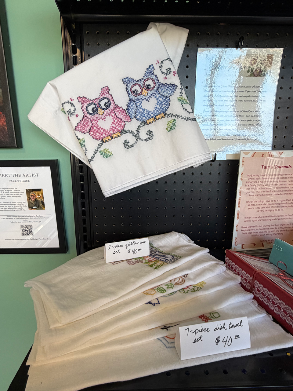 2025 merchandise is discounted 20% and includes embroidered kitchen towels and pillowcases; hand-made journals; pencil drawings; crocheted keychains and animals; books; 3-D printed toys; leather wallets, bracelets, and keychains; pottery; and paintings. We have also displayed a beautiful photo and a link to where you can purchase it.